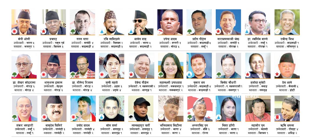 कांग्रेस सभापति गगन थापा, एमाले अध्यक्ष केपी ओली, नेकपाका संयोजक पुष्पकमल दाहाल ‘प्रचण्ड’, रास्वपा सभापति रवि लामिछाने, रास्वपाका वरिष्ठ नेता बालेन्द्र शाह ९बालेन०, जसपा नेपालका अध्यक्ष उपेन्द्र यादवले आफैँलाई भोट हाल्न पाउनेछैनन् । त्यस्तै, कांग्रेस महामन्त्री प्रदीप पौडेल, नेकपाका नेता नारायणकाजी श्रेष्ठ, राप्रपा उपाध्यक्ष रवीन्द्र मिश्र, एमाले सचिव भानुभक्त ढकाल, कांग्रेसका नेता डा। शेखर कोइरालालगायतका नेता पनि आफैँलाई भोट हाल्न नपाउने उम्मेदवारको सूचीमा छन् । उनीहरू आफ्नो मतदाता नामावली भएकोभन्दा भिन्न क्षेत्रबाट उम्मेदवार बनेका छन् ।