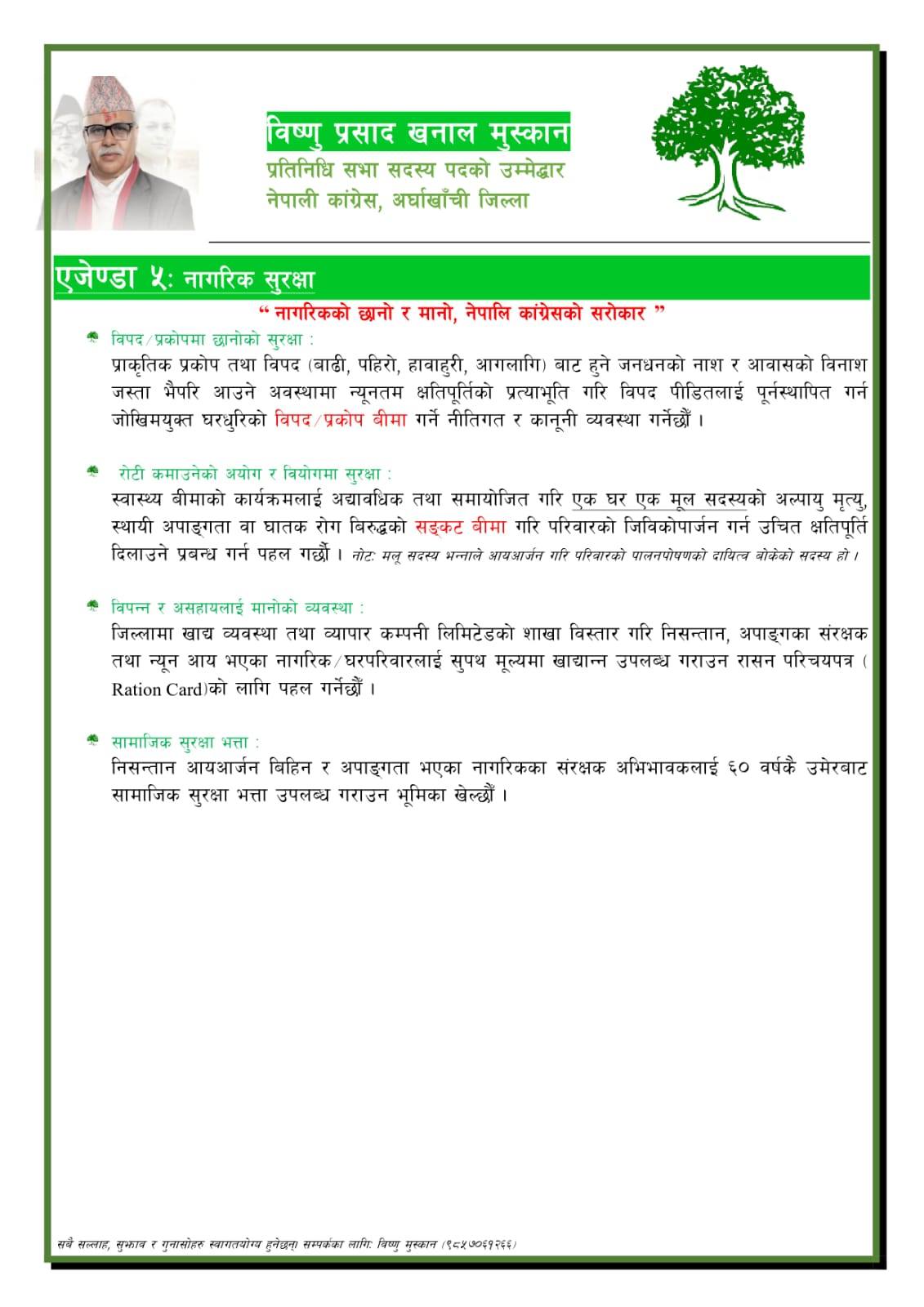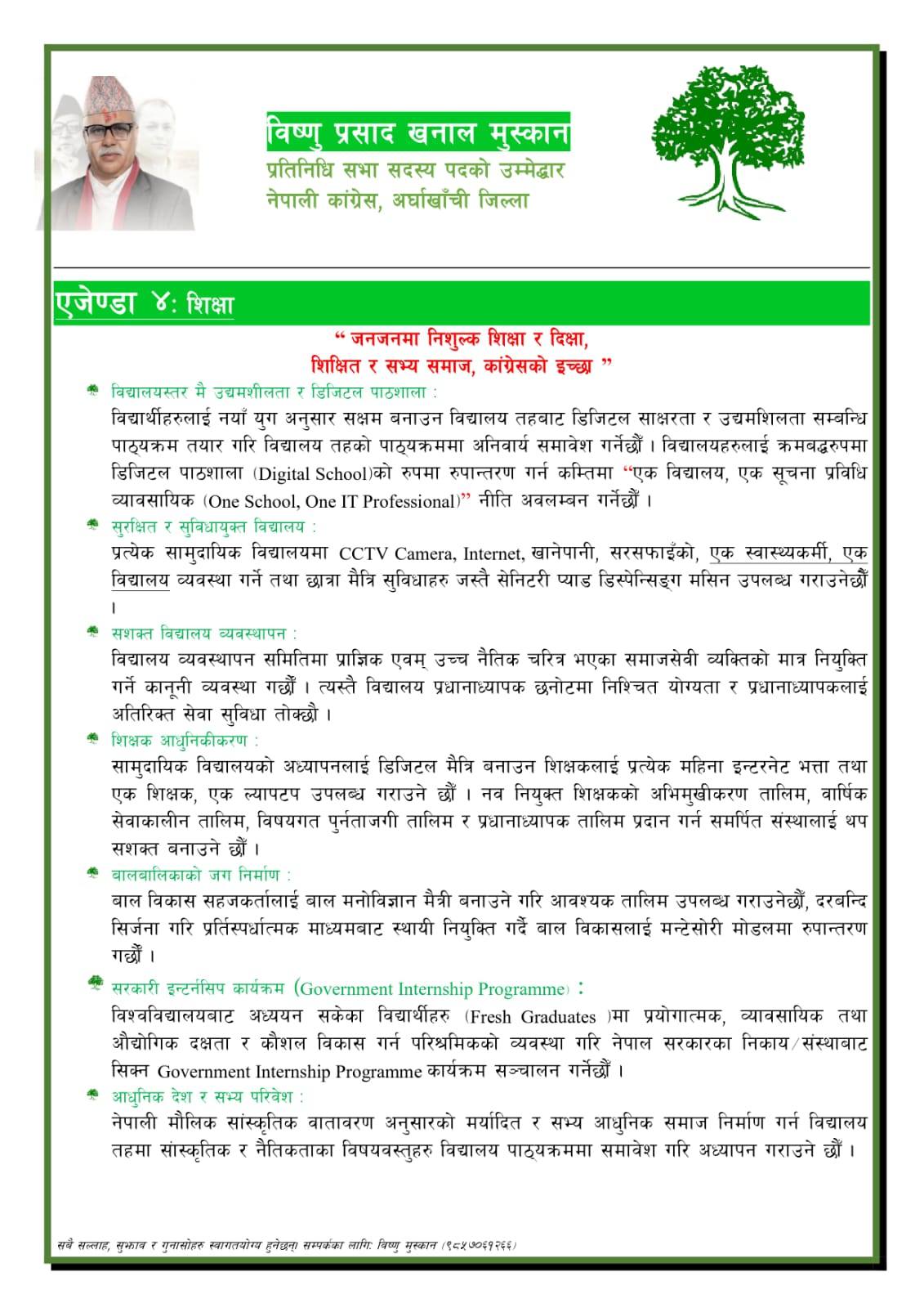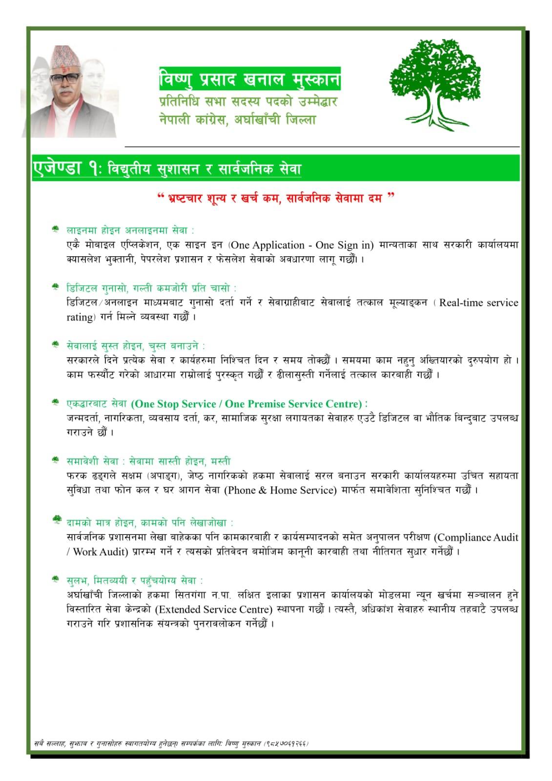अर्घाखाँची ।प्रतिनिधि सभा निर्वाचनमा नेपाली कांग्रेस अर्घाखाँचीबाट उम्मेदवार रहनुभएका विष्णुप्रसाद खनाल (मुस्कान) ले विद्युतिय शुशासन र सार्वजनिक सेवा ,कृषि वन र पशुपालन,स्वस्थ्य,शिक्षा,नागरिक सुरक्षा, पुर्वाधार विकास र निर्माण,कानुन न्याय र समावेशिता लगायतका एजेण्डा समावेश गरेर चुनावी एजेण्डा सार्वजनिक गर्नुभएको छ ।