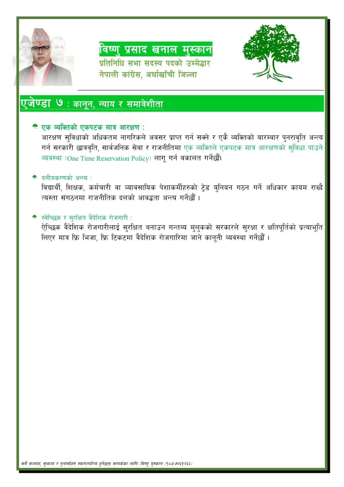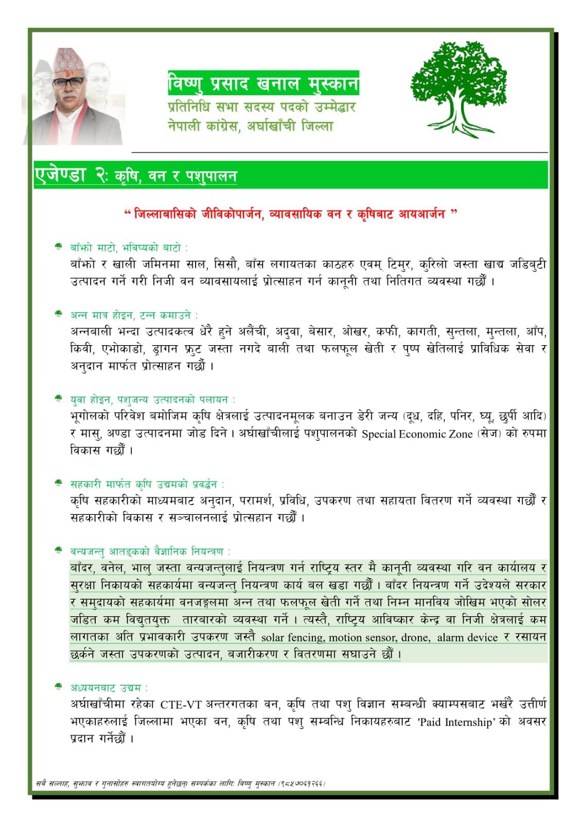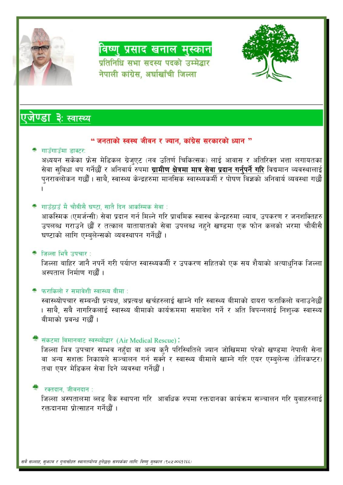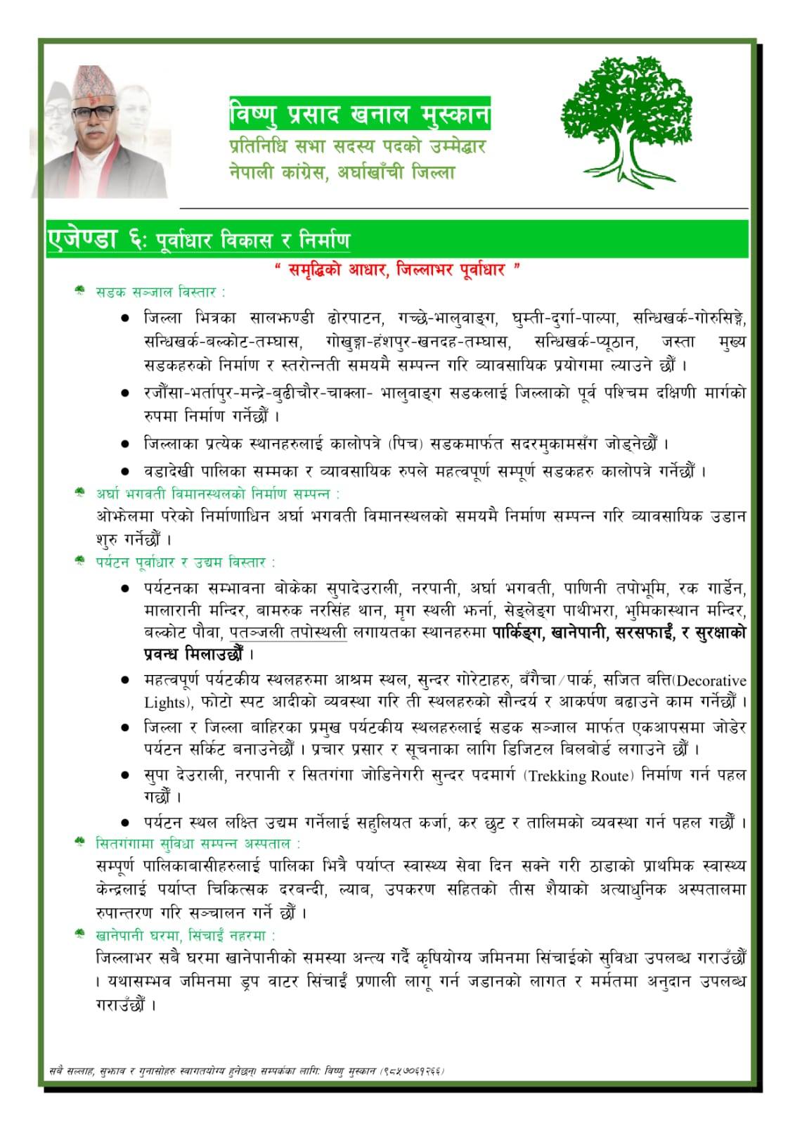अर्घाखाँची ।प्रतिनिधि सभा निर्वाचनमा नेपाली कांग्रेस अर्घाखाँचीबाट उम्मेदवार रहनुभएका विष्णुप्रसाद खनाल (मुस्कान) ले विद्युतिय शुशासन र सार्वजनिक सेवा ,कृषि वन र पशुपालन,स्वस्थ्य,शिक्षा,नागरिक सुरक्षा, पुर्वाधार विकास र निर्माण,कानुन न्याय र समावेशिता लगायतका एजेण्डा समावेश गरेर चुनावी एजेण्डा सार्वजनिक गर्नुभएको छ ।