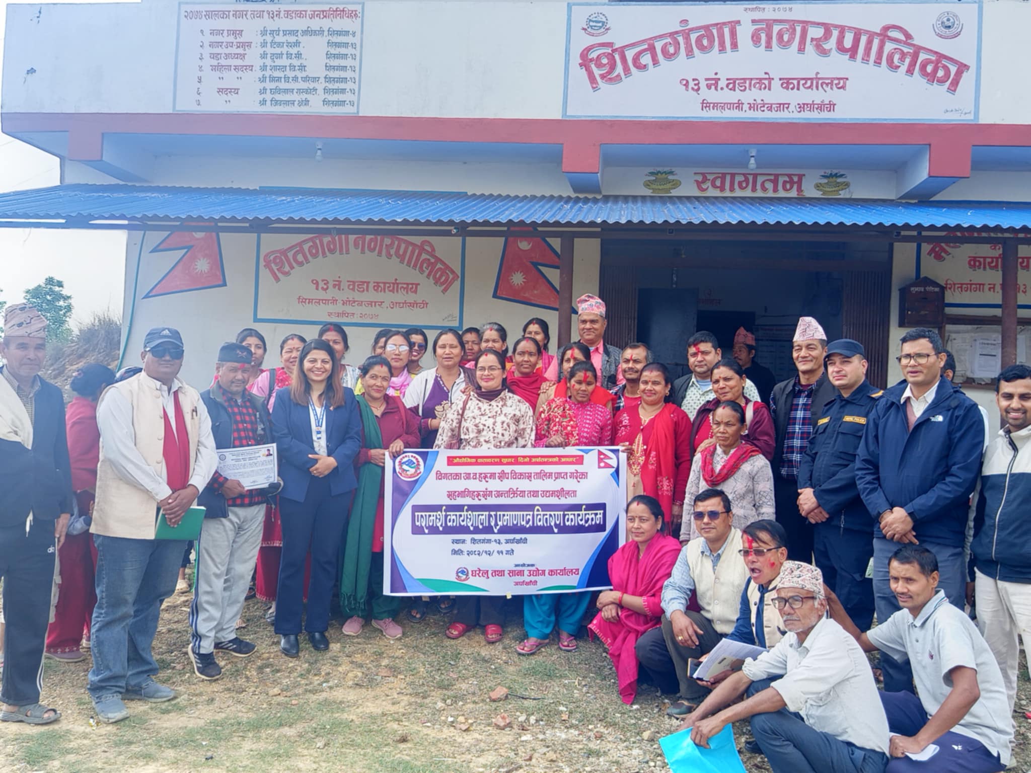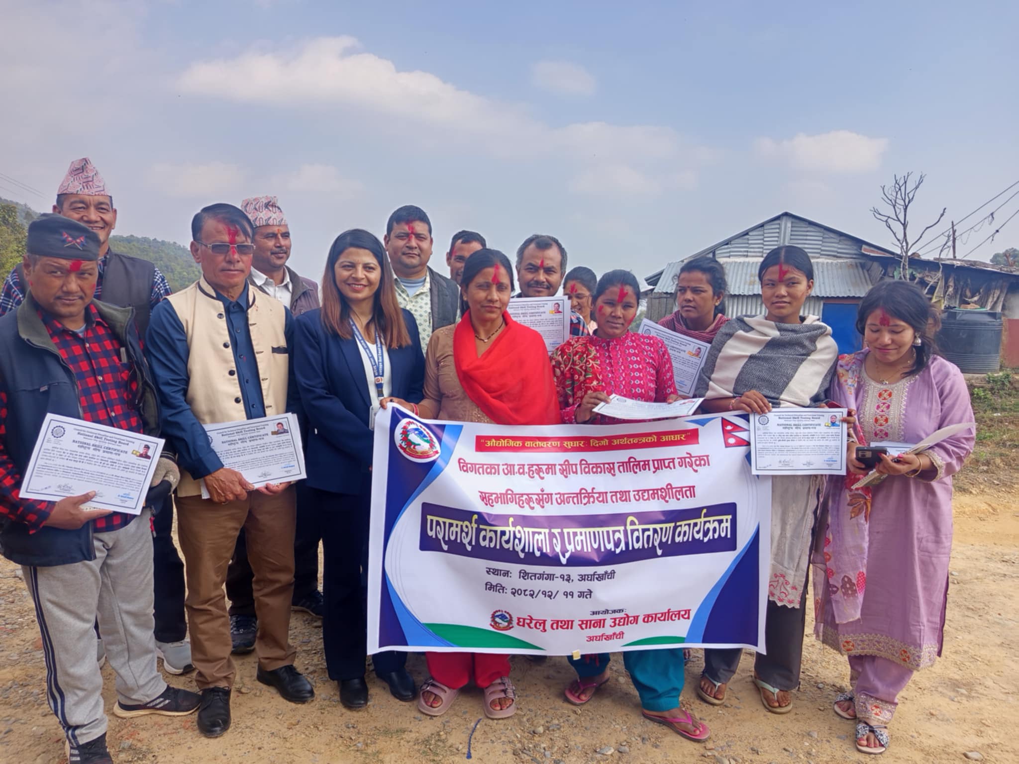 सागर महत,चैत्र १२ अर्घाखाँची ।घरेलु तथा साना उद्योग कार्यालय अर्घाखाँचीको आयोजनामा शितगंगा नगरपालिका–१३ मा विगतका आर्थिक वर्षहरूमा सीप विकास तालिम प्राप्त गरेका सहभागीहरूसँग अन्तरक्रिया तथा उद्यमशीलता परामर्श कार्यशाला सम्पन्न भएको छ। सोही कार्यक्रममा सहभागीहरूलाई प्रमाणपत्र समेत वितरण गरिएको छ।