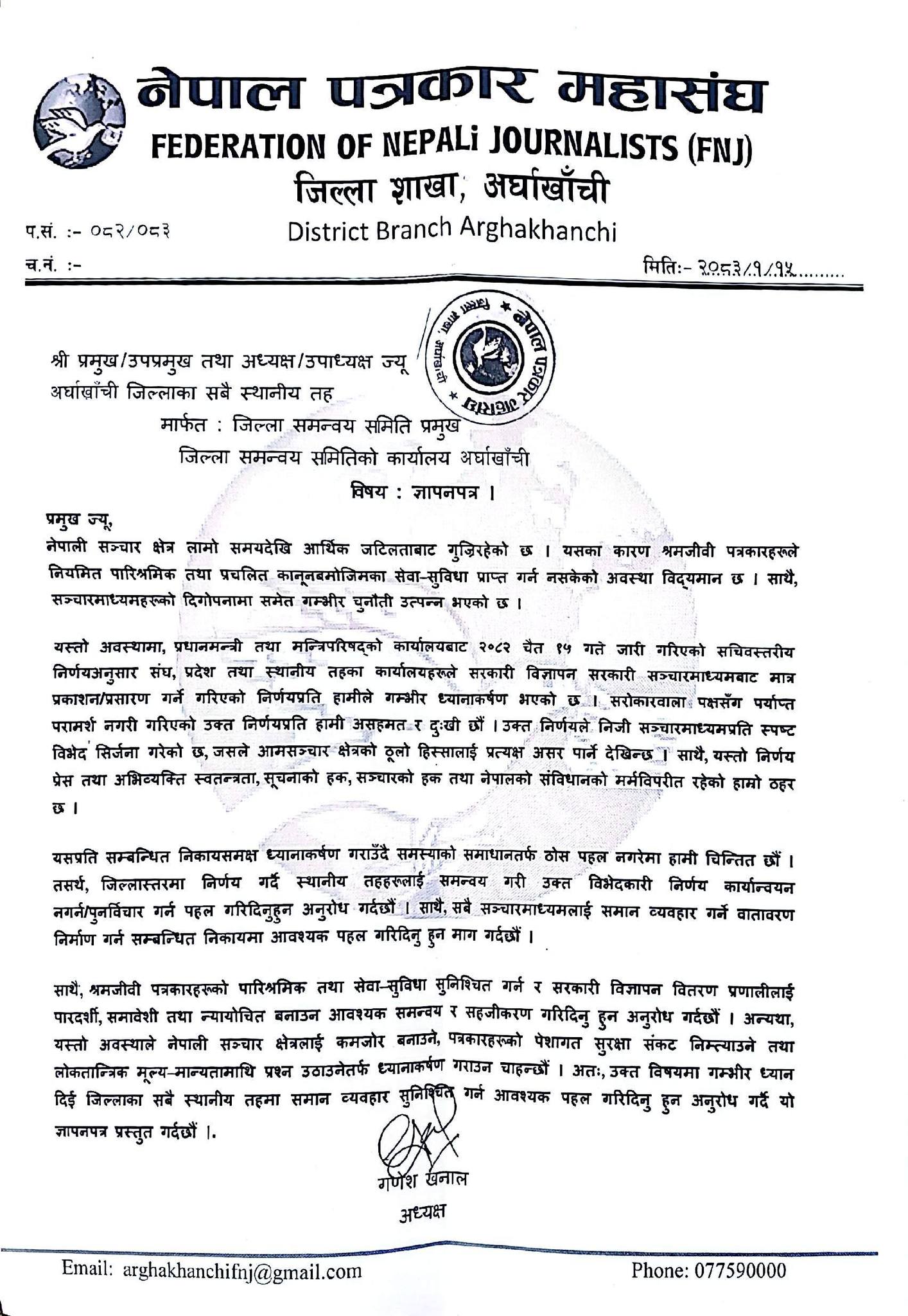 सन्धिखर्क ।नेपाल पत्रकार महासंघ अर्घाखाँची शाखाले जिल्लाका सञ्चारमाध्यममा देखिएका जटिल समस्याबारे जिल्ला समन्वय समिति प्रमुख जीवनारायण कोइरालामार्फत ६ वटै पालिकामा ज्ञापनपत्र बुझाएको छ।सरकारी सञ्चारमाध्यममा मात्रै विज्ञापनलाई सीमित गर्ने सरकारको निर्णयविरुद्ध महासंघको केन्द्रीय समितिको परिपत्रअनुसार महासंघका जिल्ला अध्यक्ष गणेश खनालले नेपाली सञ्चार क्षेत्र लामो समयदेखि आर्थिक संकटबाट गुज्रिरहेको उल्लेख गर्दै ज्ञापनपत्र बुझाएको बताउनुभयो।